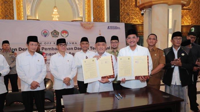 Mendes Yandri bersama Menag Nasaruddin menyaksikan penandatanganan Perjanjian Kerja Sama antara Dirjen Pembangunan Desa dan Perdesaan Nugroho Setijo Nagaro dengan Dirjen Bimas Islam Kemenag Abu Rokhmad dan Antara Dirjen Percepatan Pembangunan Daerah Tertinggal Samsul Widodo dengan Dirjen Bimas Islam Abu Rokhmad.